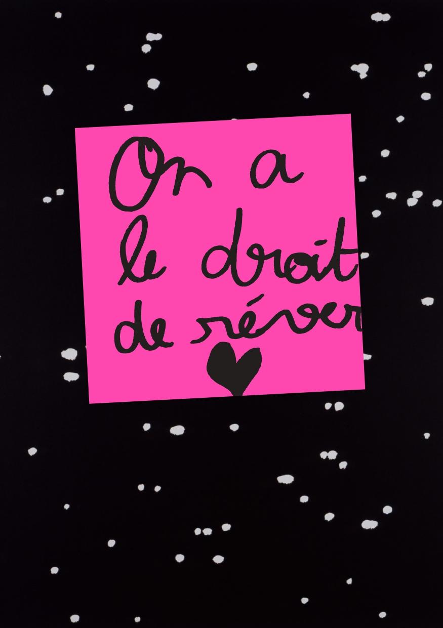 Composition involontaire collective, post-it sur impression papier, 2024 Arrière-plan: Jugnet + Clairet, The Baby of Macon #1 (détail), 2001, acrylique sur toile ©Adagp, Paris, 2025