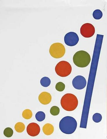 rgba(255,255,255,1) Albert ChubacSans titre ( C_L02_0510_00 )Collage, une baguette bleue, opposée d'un côté à un ensemble de disques en bleu, rouge, jaune et vert ; de l'autre, un disque bleu, dim 65 x 50 cm© Leclere svv Demande d'information