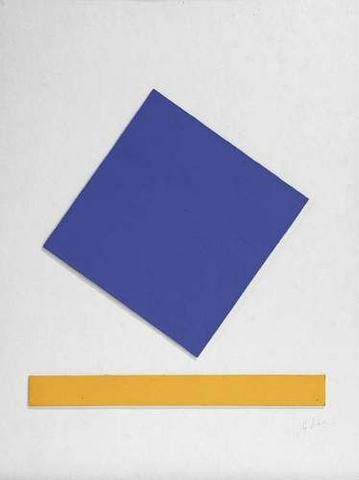 rgba(255,255,255,1) Albert ChubacSans titre ( C_L02_0518_00 )Collage, un carré bleu en équilibre sur un rectangle jaune, dim 65 x 50 cm, signé© Leclere svv Demande d'information
