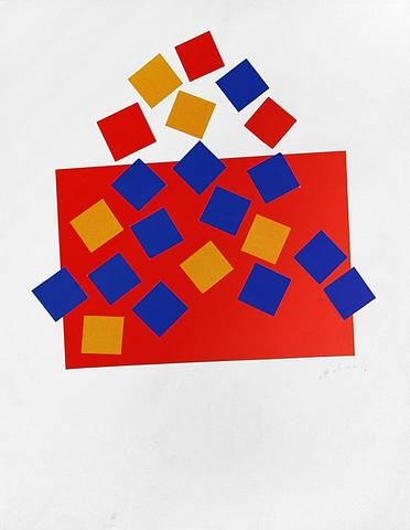 rgba(255,255,255,1) Albert ChubacSans titre ( C_L02_0522_00 )Collage, ensemble de carrés en rouge, jaune et bleu sur un fond rectangulaire en rouge, carton gouaché, dim 65 x 50 cm© Leclere svv Demande d'information