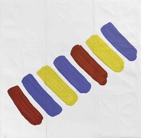rgba(255,255,255,1) Albert ChubacSans titre ( G_L01_0025_00 )Gouache, alternance de traits en rouge, bleu et jaune, sur papiers assemblés, dim 65 x 50 cm© Leclere svv Demande d'information