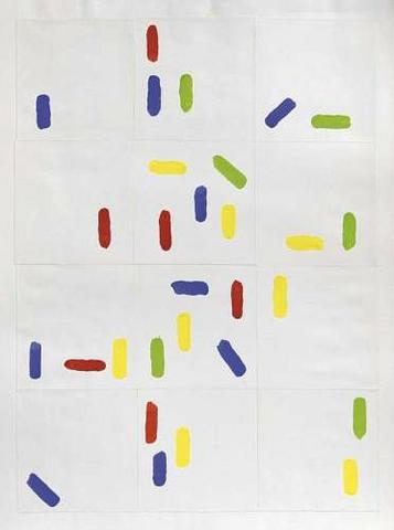 rgba(255,255,255,1) Albert ChubacSans titre ( G_L02_0355_00 )Gouache, ensemble de traits verticaux, obliques et horizontaux en bleu, rouge, jaune et vert, sur papiers assemblés, dim 65 x 50 cm© Leclere svv Demande d'information