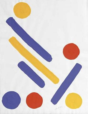 rgba(255,255,255,1) Albert ChubacSans titre ( G_L02_0357_00 )Gouache, trois traits en bleu, un en jaune pour 2 disques en jaune, 2 en rouge et un bleu, dim 65 x 50 cm, signé.© Leclere svv Demande d'information