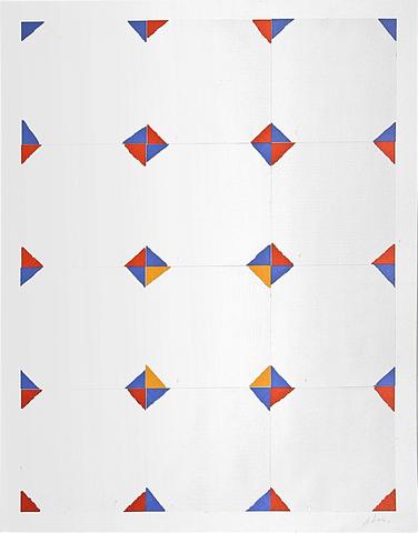 rgba(255,255,255,1) Albert ChubacSans titre ( G_L02_0374_00 )Gouache, triangle en bleu, en rouge et orange formant carrés aux angles, papiers assemblés, dim 65 x 50 cm© Leclere svv Demande d'information