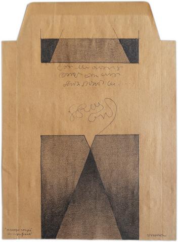 Dessin au crayon sur enveloppe, titré "message coupé in-signifiant" en bas à gauche" et signé "STEMPFEL" en bas à droite.