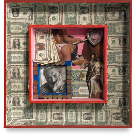 Assemblage d'objets divers dans un boîtage, billets, pièces, photo d'Arman, portrait de Gilli dans un coeur, découpage de pin up et du roi Louis XIV.