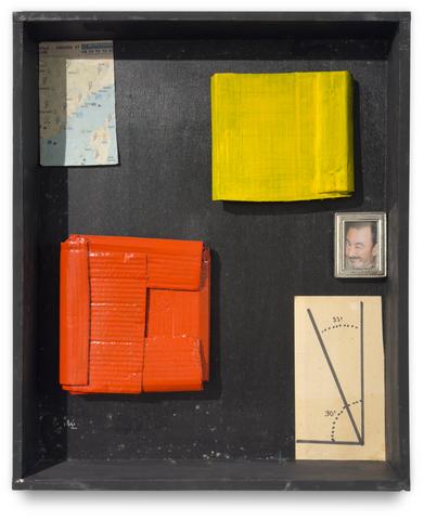 Carton peints, tracé géométrique et carte météo dans une boîte peinte.