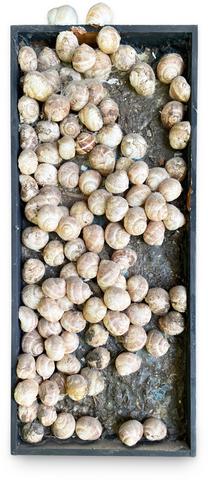 Collage de coquilles d'escargots sur bois.