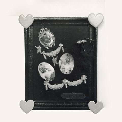 rgba(255,255,255,1) Claude GilliEx-voto (anniversaire et coeurs) — 1962Assemblage et collage d'objets et photographies.Dimensions inconnues.© Archives Claude Gilli Demande d'information