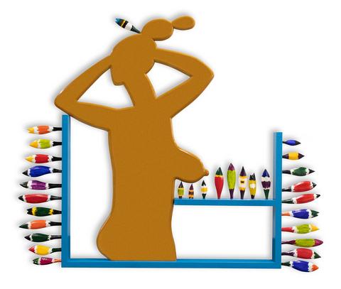 rgba(255,255,255,1) Claude GilliFemme choisissant une plume dans un magasin de plumes — 2006Sculpture, Hauteur: 200 cm — Largeur: 225 cm — Profondeur: 8 cm.