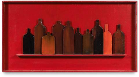 Pièce signée, datée et titrée à deux reprises au dos, "Les Bouteilles, la Nuit, 64" et "Le rouge est mit, 64".