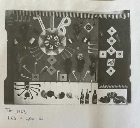rgba(255,255,255,1) Claude Gillitirs — 1963Peinture et assemblage d'objets.Hauteur: 130 cm — Largeur: 163 cm Demande d'information