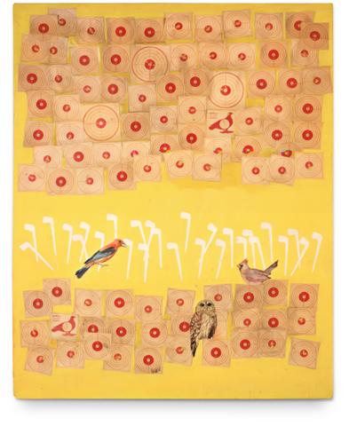 Collages sur toile, peinture acrylique et assemblages d'objets, cibles, plumes.