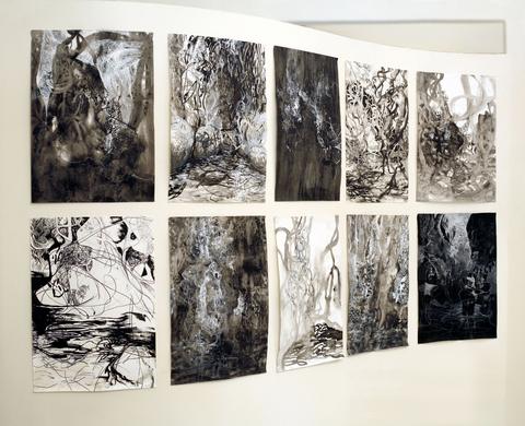 installation de dix dessins sur papiers entre 2004 et 2007, chacun 45 x 63 cm, l'ensemble 131 x 245 cm