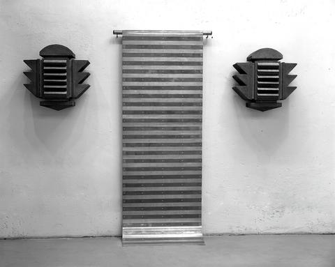 rgba(255,255,255,1) Henri FoucaultTriptyque du rouleau - 1987Sculpture, 3 éléments : 2 éléments ( 80 cm x78 cm x36 cm) et 1 (120 cm x 300 cm). Bois, plomb, zinc, acier et rivets.© Henri Foucault Studio Demande d'information