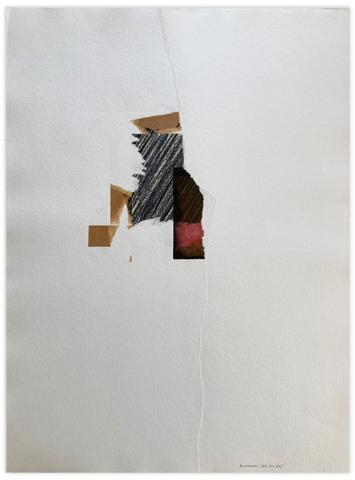 Aquarelle, encre de Chine, plume et lavis, avec arrachage bande kraft, frottage, hachure de crayon gras et déchirage sur papier contrecollé.