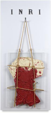 Assemblage « socio-critique » composé d'un tee-shirt teinté à l’encre rouge, encadré sous plaque de verre et suspendu sur un panneau où est inscrit INRI.