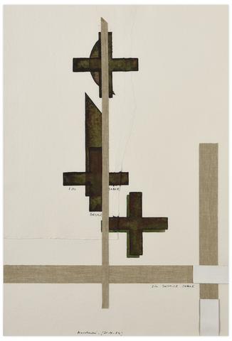 Aquarelle et encre de Chine, plume et lavis, collage de bandes de lin et arrachage sur papier, 55,5 x 38 cm.