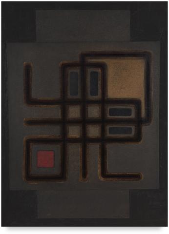 Peinture en techniques mixtes, huile, encre et collage sur carton industriel, 73 x 54,5 cm.