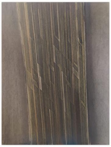 Peinture en techniques mixtes (gesso, crayon gras, graphite, hachure et collage de bandes papier) sur papier fort.