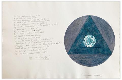 Poème manuscrit de Bernard Vargaftig sur une planche de gravure retravaillée à l’aquarelle d’Henri Maccheroni, tirée à part de Jérusalem Trêves et Rêves (LMG, 1993) sur papier