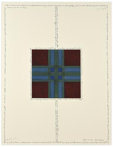Texte manuscrit de Michel Butor sur une peinture de Henri Maccheroni mêlant aquarelle, encres et collage de bandes superposées sur papier contrecollé sur carton blanc, 62 x 47 cm