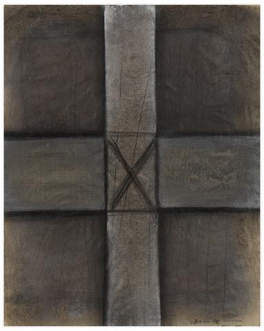 Peinture, fusain, pastel crayons gras, graphite et gesso sur papier lin, 52 x 42 cm.