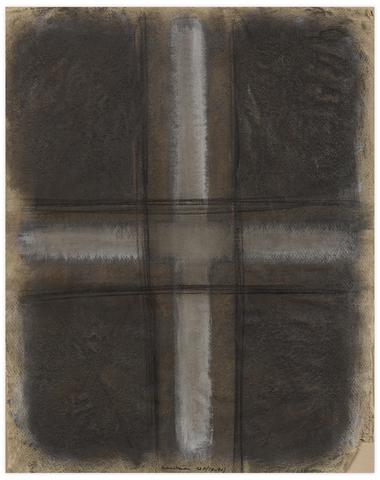 Peinture en techniques mixtes, gesso, encre, fusain et crayons gras sur papier lin, 53 x 41 cm.