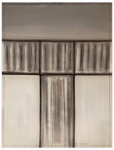 Peinture en techniques mixtes (gesso, huile, fusain, crayon gras, acrylique) sur papier enduit toilé.