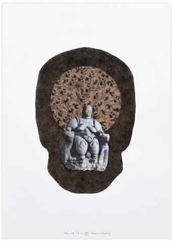 Collage en techniques mixtes (découpe, encrée Chine, gesso et image cartonnée couleur) sur papier fort.