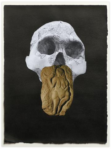 Collage en techniques mixtes (découpe, encre de Chine, photo et image cartonnée couleur) sur papier fort.