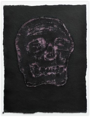 Dessin de crâne à la cire, encre de Chine, aquarelle et frottage sur papier fort