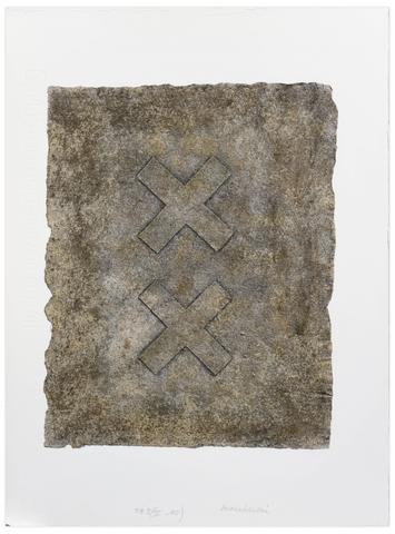 Peinture en techniques mixtes (découpe de croix, ocres du Roussillon, sable, gesso sur papier chargé en lin) contrecollé sur papier fort.