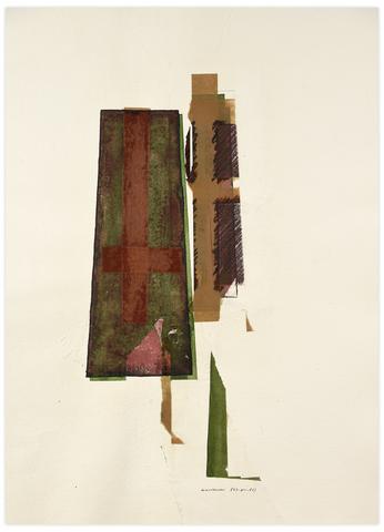 Aquarelle, encre de Chine, crayons gras, fusain, kraf avec hachures et arrachement sur papier, 76 x 57 cm.