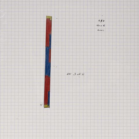 rgba(255,255,255,1) Henri ProsiEn 3 et 6 ou division en 3/6 — 2001—618Peinture acrylique sur toile, 120 x 6 cm.© Henri Prosi Demande d'information