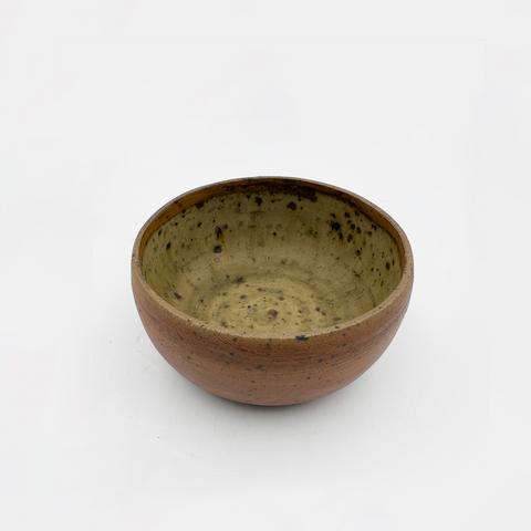 Grès légèrement pyrité naturel à l'extérieur et émail à la cendre à l'intérieur.
