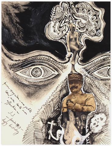 Dessin à l'encre et collage sur papier, 26,5 x 20,5 cm.