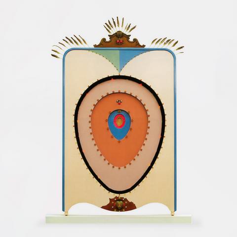 Sculpture murale électrifiée, assemblage de bois peint, métal, cuir, verre, caoutchouc, plumes, guirlande lumineuse, 356 x 215 x 42,5 cm.