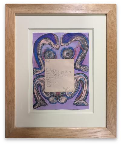Aquarelle de Jean-Jacques Lebel sous un poème de Michel Leiris, 50 x 23,5 cm.