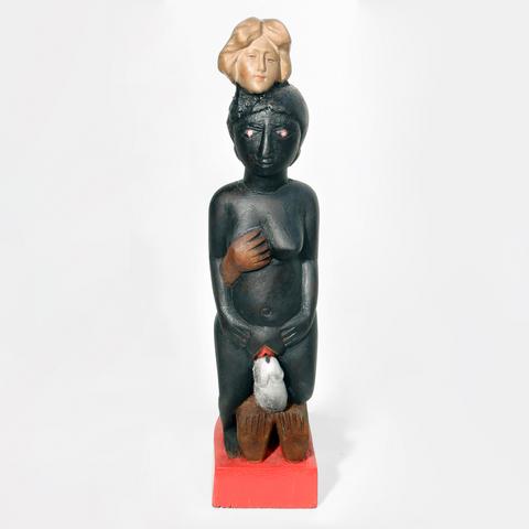 Sculpture de Madagascar surmontée d'une sculpure en plâtre, peinture rouge.