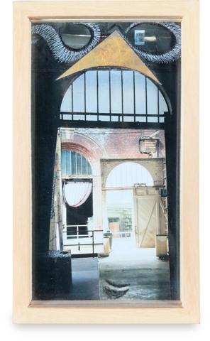 rgba(255,255,255,1) Jean-Jacques LebelPortrait piranésien et arcimboldesque d'un gonze chapeauté (avec plume), 1980Photo peinte, 19,5 x 11,5 cm.Pièce signée, titrée et datée au dos. Demande d'information