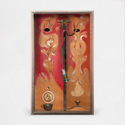 Sculpture, bois, métal, velours et peinture.