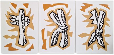 Peinture. Triptyque. Octobre 2024. Acrylique sur toile. Blanc, noir, jaune, orange.