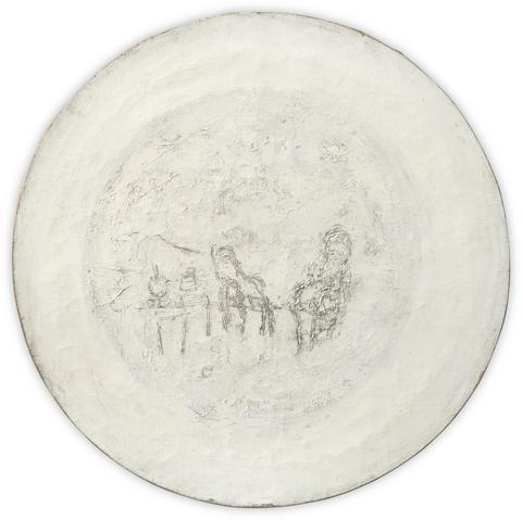 rgba(255,255,255,1) Michel PotageBeckett’s Chairs & Brushes-Boxes — 1992MP0042Tondo, huile sur toile, 100 x 100 cm. Pièce signée « Michel Potage » au dos sur la toile, titrée « Brushes-Boxes » et datée « 1992 » sur le châssis.© Archives Michel Potage