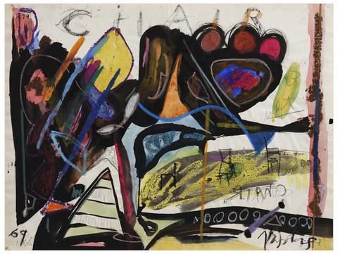 rgba(255,255,255,1) Norris EmbryChair, 1968-69Signé 'Norris' (en bas à droite), daté '69-1968' (en bas à gauche) encre, aquarelle, pastel gras et graphite sur papier 45.5 x 60.5 cm. Inscription: 'CHAIR / Balt'
