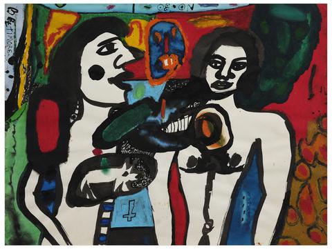 rgba(255,255,255,1) Norris EmbryCouple et chien, 1980Signé et daté 'NO . 80' (en haut au centre) encre, aquarelle et crayon gras sur papier 45.5 x 60.5 cm. Inscription: 'Baltimore'