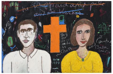 rgba(255,255,255,1) Norris EmbryCross Between (homme et femme), 1977Signé et daté 'NO 1977' (en bas au centre), titré 'The Cross between' au revers Acrylique, crayon gras sur carton entoilé 60,5 x 91 cm.