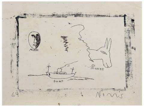 rgba(255,255,255,1) Norris EmbryMask, Donkey, Boat, 1964Signé 'Norris' (en bas à droite), daté '64' (en bas à gauche) monotype sur papier 41 x 55.5 cm. Inscriptions: 'MASK / DO DONKEY / boat'