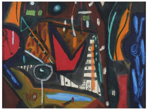 rgba(255,255,255,1) Norris EmbrySans titre (Composition abstraite, forme rouge et rayures), 1980Signé 'NO' (en bas à gauche), daté '80' en bas au centre Encre, crayon gras sur papier 46 x 61 cm.
