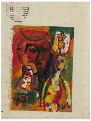 rgba(255,255,255,1) Norris EmbrySans titre (Deux figures en pied, trois visages de profil), vers 1963Signé 'Norris' (en bas à droite) feutre, crayon gras et stylo à bille sur papier et collage contrecollé sur papier 28.9 x 21.6 cm.